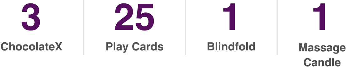 Split one chocolate with your partner and consume it 30 mins prior. Use our naughty cards, massage oil and blindfold to engage with your partner.